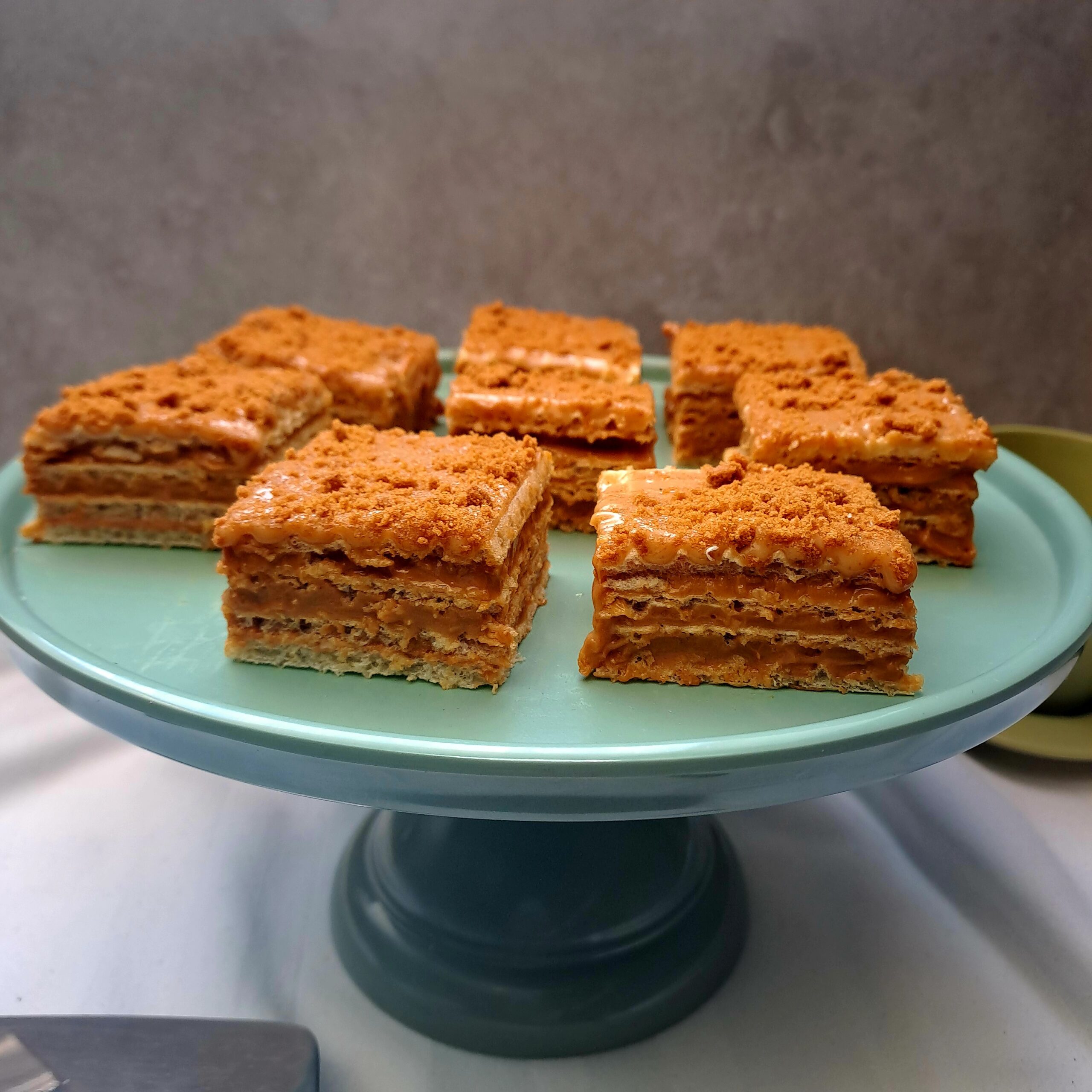 4. Mezitím si připravím karamelovou ganache, kterou naliji na povrch oplatky a zasypu sušenkami Lotus.